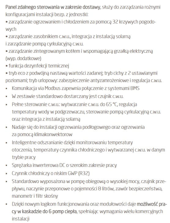 Główne cechy: - pompa ciepła typu monoblok dla ogrzewania, chłodzenia i wytwarzania c.w.u - szeroki zakres pracy: temperatura zewn. w trybie grzania do -25 C, w trybie chłodzenia do +43C - podwójna sprężarka rotacyjna z inwerterem prądu stałego z wewn. zabezpieczeniem termicznym i wytrzymałym korpusem, zam. na amortyzatorach antywibracyjnych i izolowana, aby zmniejszyć przenoszenie hałasu i wibracji podczas pracy