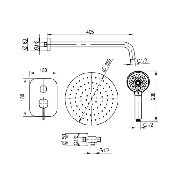 Dane techniczne: - ciśnienie maksymalne: 1,0 MPa, - temperatura maksymalna: 70°C - przyłącze: G 1/2 - długość ramienia: 405 mm - długość rączki: 238 mm - średnica głowicy: 250 mm