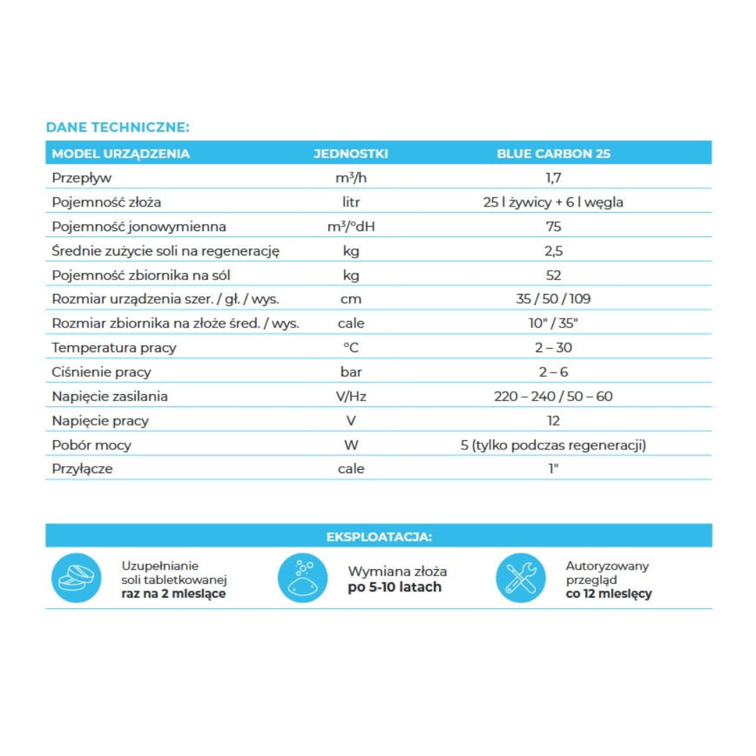 BLUE Zestaw: stacja zmiękczania wody z aktywnym węglem 25 L, korpus 10" 3-częściowy 1"
