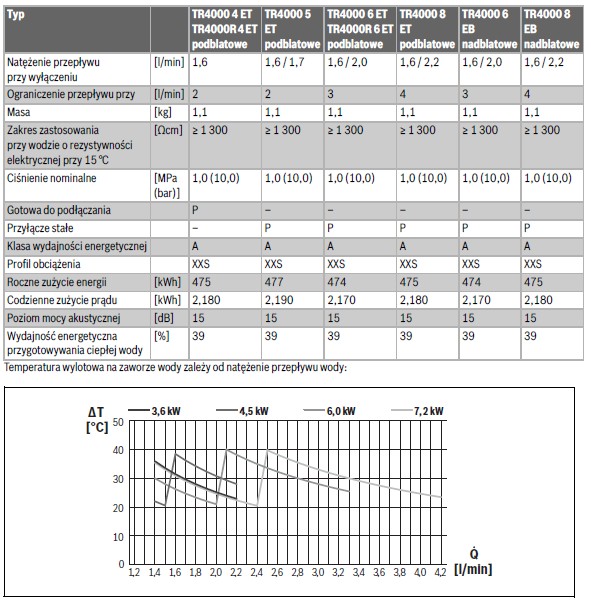 BOSCH (SIEMENS) TRONIC TR4000 6 EB to podgrzewacz przepływowy jednofazowy, sterowany elektronicznie. Nowatorska grzałka zespolona zapobiega skokom temperatury wody wskutek przegrzania oraz skraca czas podgrzewania wody. Konstrukcja urządzenia pozwala na łączenie z ogólnodostępną armaturą.