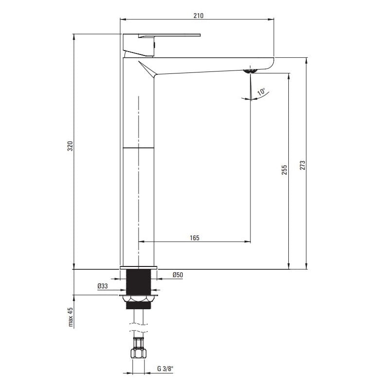 Dane techniczne: - zasięg wylewki: 165 mm - wysokość baterii: 320 mm - głowica ceramiczna: 35 mm - długość wężyków przyłączeniowych: 600 mm