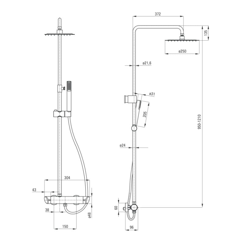 Dane techniczne: - drążek o wysokości: 950-1210 mm - stalowa głowica o średnicy: 250 mm - słuchawka: 205x31 mm - wąż natryskowy: 1500 mm