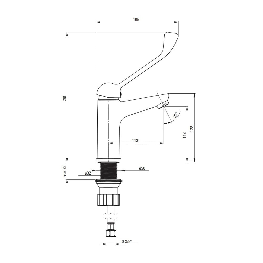 Dane techniczne: - wysokość: 261 mm - długość: 165 mm - zasięg wylewki: 113 mm - przyłącze: G 3/8