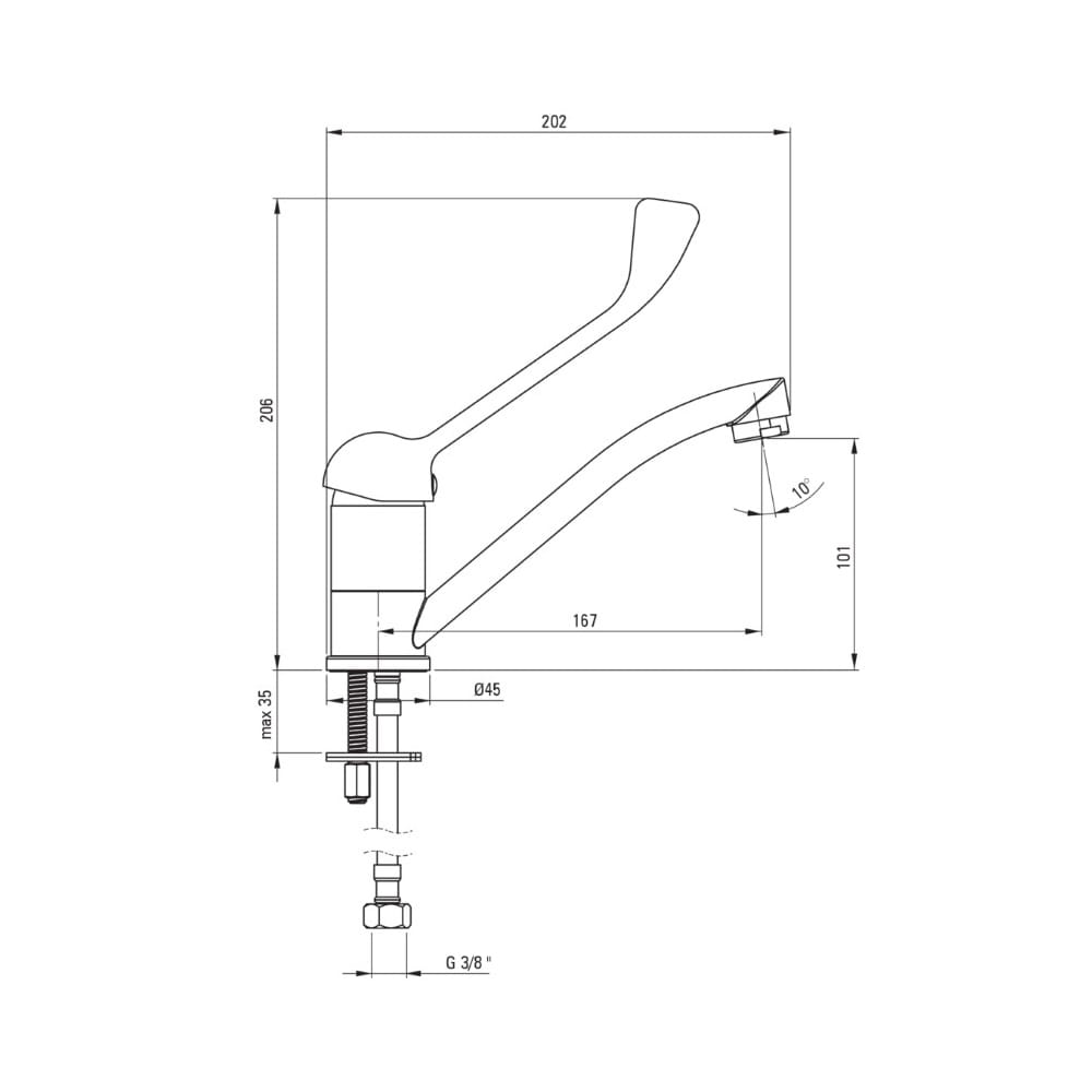 Dane techniczne: - wysokość: 206 mm - długość: 202 mm - zasięg wylewki: 167 mm - przyłącze: G 3/8