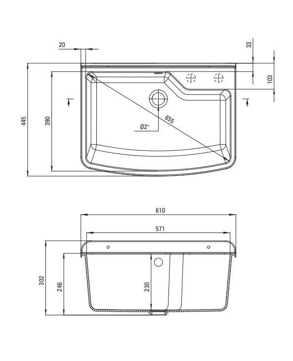 Dane techniczne: - długość: 610 mm - szerokość: 445 mm - wysokość: 302 mm - głębokość komory: 230 mm - średnica odpływu: 2''