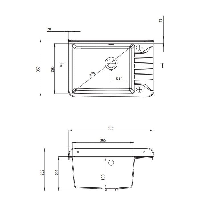 Dane techniczne: - długość: 505 mm - szerokość: 350 mm - wysokość: 252 mm - głębokość komory: 190 mm - średnica odpływu: 2'