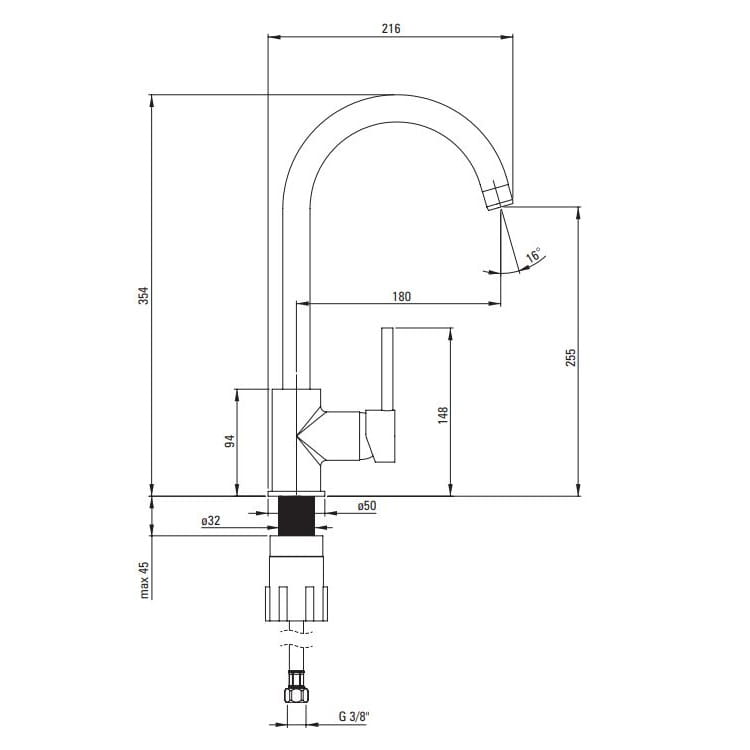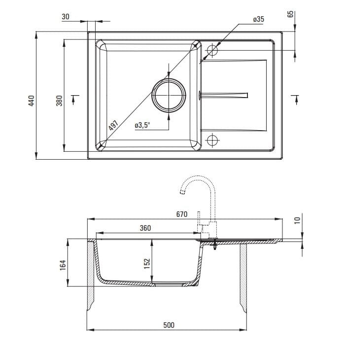 Dane techniczne: - długość: 670 mm - szerokość: 440 mm - wysokość: 164 mm - głębokość komory: 152 mm - średnica odpływu: 3,5' - wysokość baterii: 354 mm - zasięg wylewki: 180 mm - długość wężyków przyłączeniowych: 450 mm