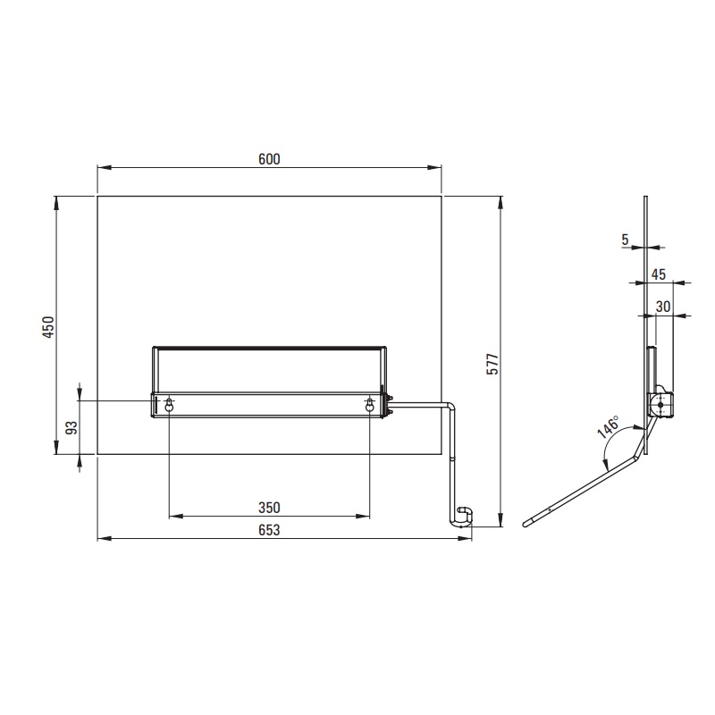 Dane techniczne: - wysokość: 450 mm - szerokość: 600 mm - głębokość: 45 mm - kąt nachylenia lustra w zakresie od 0 do 22 stopni