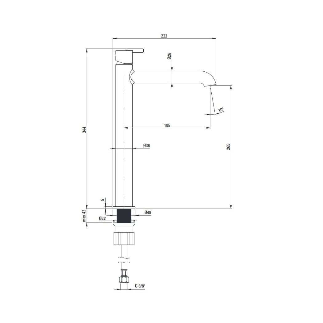 Dane techniczne: - wysokość baterii: 344 mm - długość baterii: 222 mm - zasięg wylewki: 185 mm - przyłącze: G 3/8
