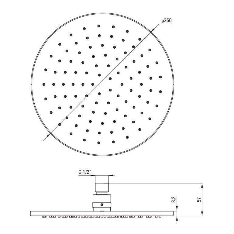 Dane techniczne: - średnica głowicy natrysku: 250 mm - średnica słuchawki: 32 mm - długośc słuchawki: 211 mm - ramię natrysku: 403 mm - długość węża natrysku: 1500 mm