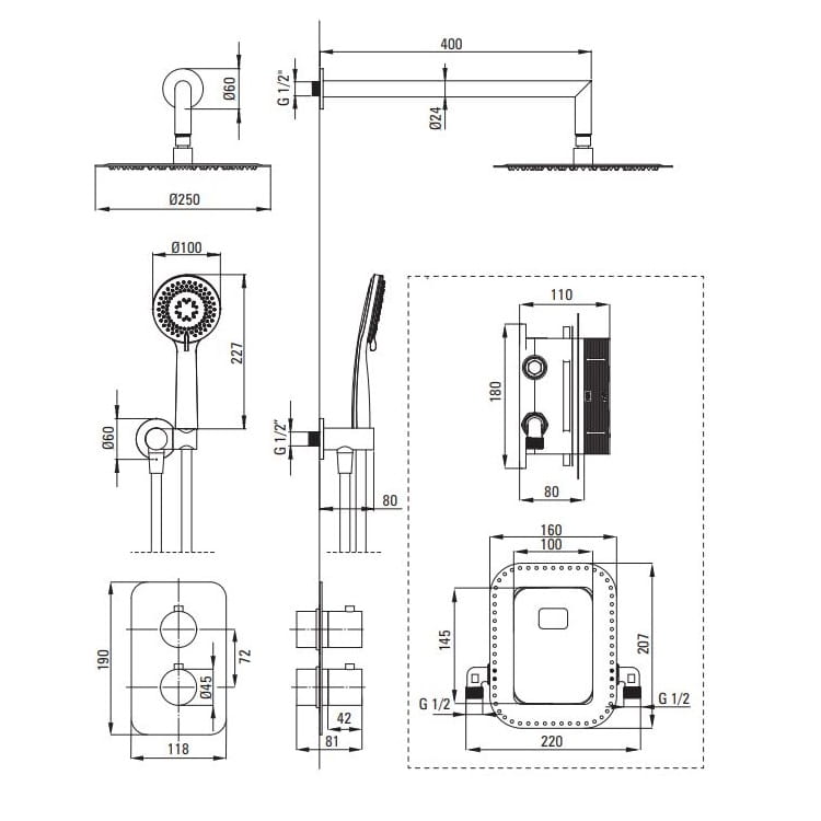 Dane techniczne: - średnica głowicy natrysku: 250 mm - średnica słuchawki: 100 mm - długośc słuchawki: 227 mm - ramię natrysku: 400 mm - długość węża natrysku: 1500 mm