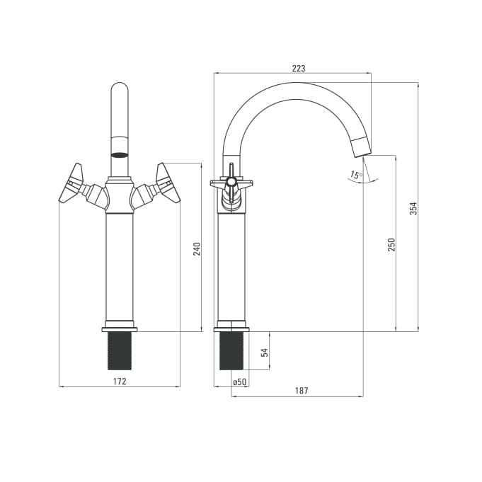 Dane techniczne: - głowica o kącie obrotu 90° - zasięg wylewki:187 mm - wysokość korpusu: 354 mm - długość wężyków przył.: 450 mm - klasa przepływu: A - 9-15 l/min
