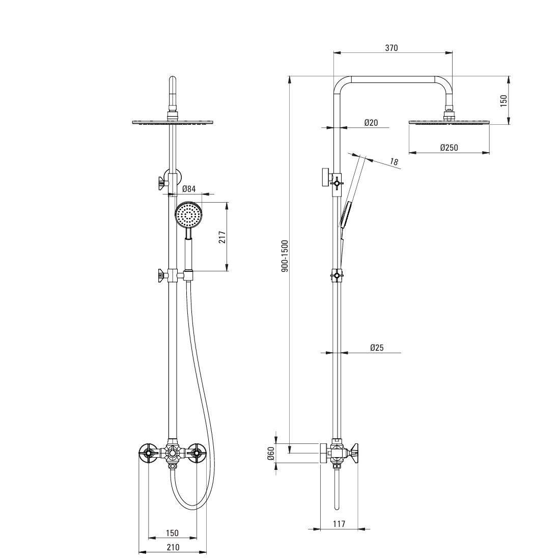 Dane techniczne: - wysokość: 1500 mm - szerokość: 370 mm - drążek o regulowanej wysokości: 940-1500 mm - mosiężna głowica natryskowa o średnicy 250 mm - słuchawka o wymiarach 217x84 mm - wąż o długości 1500 mm