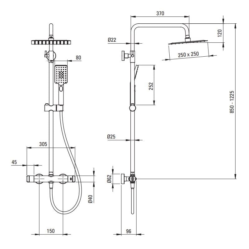 Dane techniczne: - drążek o wysokości: 850-1225 mm - wymiary głowicy natryskowej: 250x250 mm - wymiary słuchawki natrysku: 255x95 mm - wąż natryskowy: 1500 mm