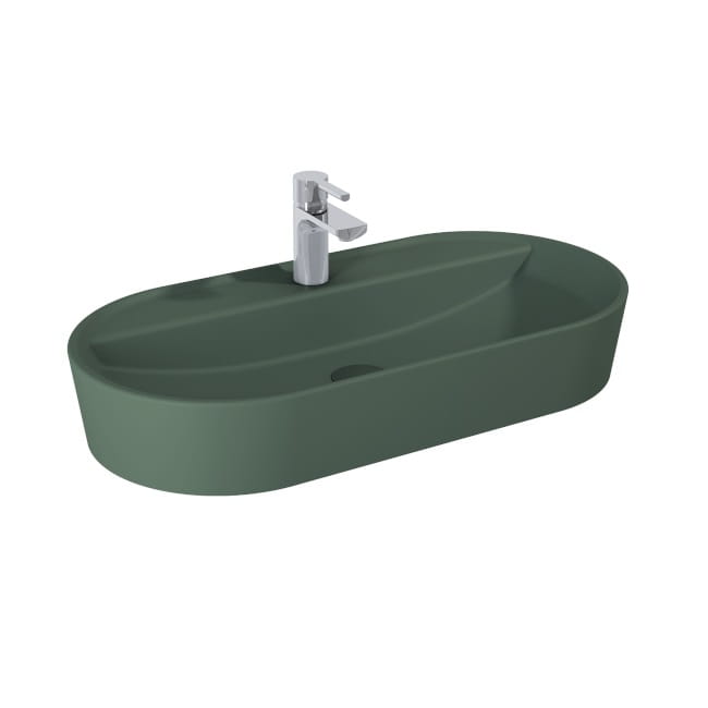 Główne cechy: - kolor: zielony (leśny) mat - materiał: ceramika sanitarna - typ: nablatowa - kształt: owalna - otwór na baterię - brak otworu przelewowego