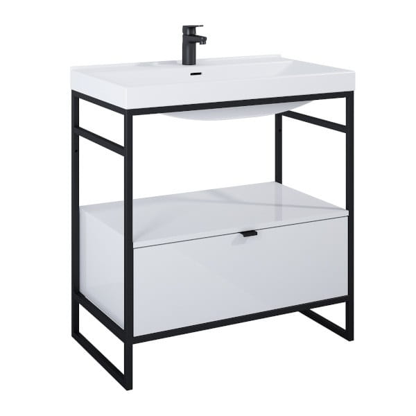 Główne cechy: - kolor: biały połysk - montaż: stojąca - front i korpus wykonany z płyty laminowanej - 1 szuflada z funkcją cichego samodomyku oraz z pełnym wysuwem - uchwyt aluminiowy w kolorze czarnym