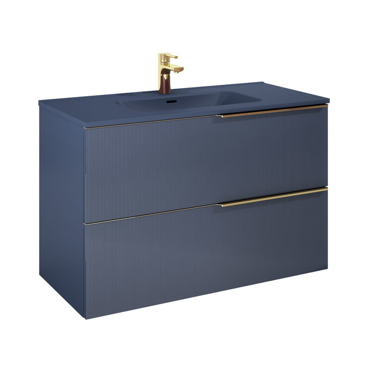 Główne cechy: - kolor: granatowy - wykończenie: matowe/lakierowane - montaż: wisząca - front pokryty ryflowanym szkłem - prowadnice soft-close, pełen wysuw - metalowe boki szuflad - uchwyty do nabycia osobno – dostępne w różnych wersjach kolorystycznych