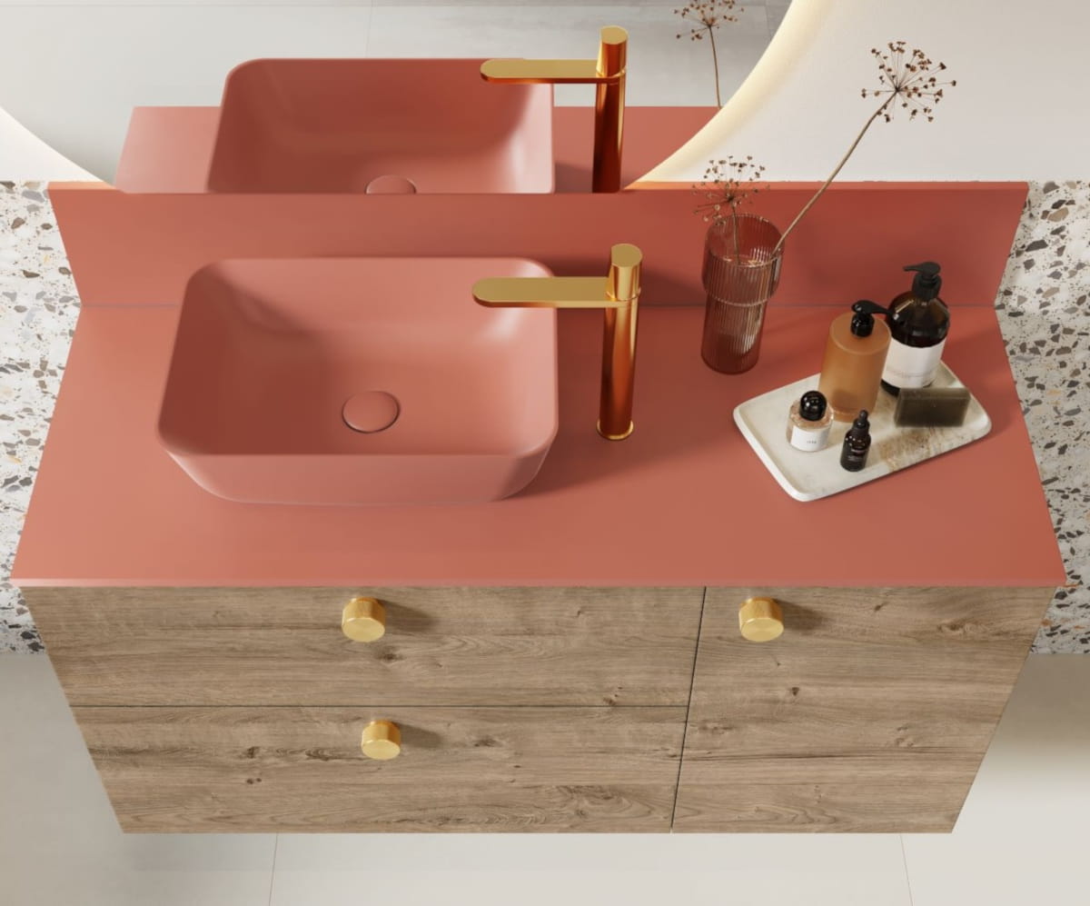 To w 100% naturalny, ekologiczny materiał, wykonany w 97% z marmuru pochodzącego z recyklingu + 3% z żywicy naturalnej. Marmur po wytworzeniu malowany jest farbą ceramiczną, utwardzaną w piecu w dokładnie takiej samej technologii jak umywalki ceramiczne, dla zapewnienia jeszcze większej wytrzymałości.