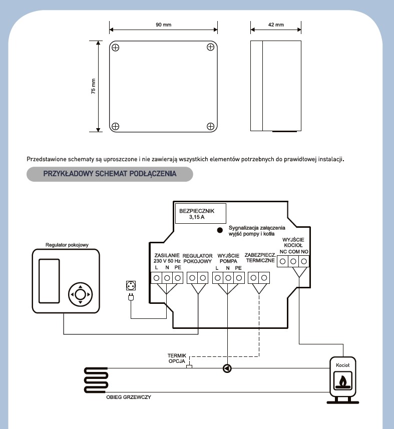 - Wyposażenie regulatora Sterownik Euroster FH1, przewód zasilający, kołki rozporowe, instrukcja obsługi z gwarancją