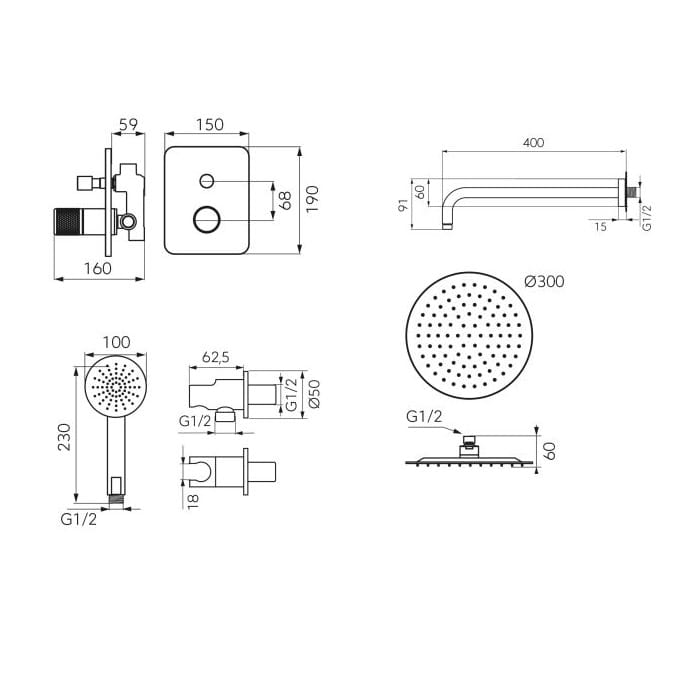 W zestawie znajduje się deszczownica, bateria, uchwyt, wąż oraz rączka natrysku.