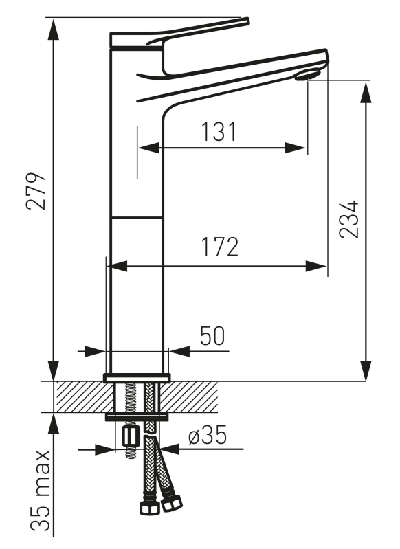 Dane techniczne: - zasięg wylewki: 172 mm - średnica przyłącza: 3/8" - rozmiar rozety: 50 mm - wysokość baterii: 279 mm - długość wężyków przyłączeniowych: 350 mm