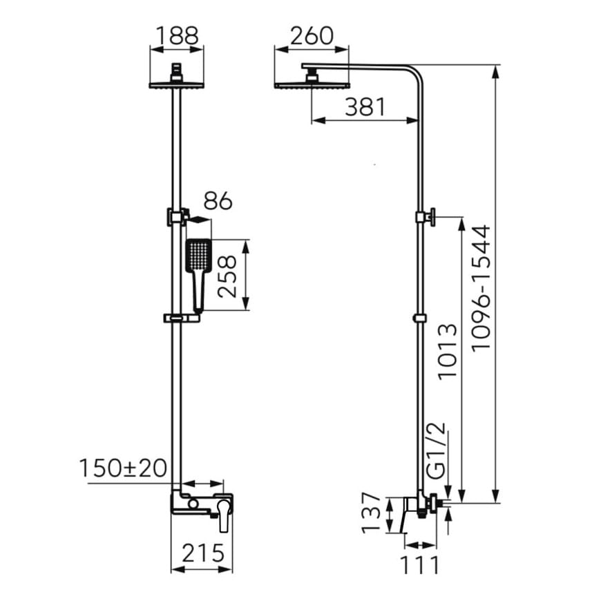 Dane techniczne: - długość baterii: 215 mm - długość węża: 1500mm - słuchawka o wymiarach: 258x86 mm - deszczownica: 260x188 mm - zasięg ramienia natrysku: 381 mm - regulowany drążek natrysku: 1096-1544 mm