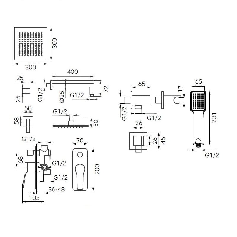 W zestawie znajduje się deszczownica, bateria, uchwyt, wąż oraz rączka natrysku.