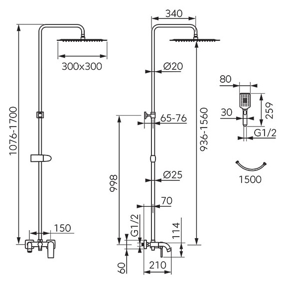 Dane techniczne: - zasięg wylewki: 210 mm - średnica przyłączy: 1/2" - zasięg deszczownicy: 340 mm - wymiary słuchawki: 80x259 mm - długość węża natrysku: 1500 mm - wymiary deszczownicy: 300x300 mm - rozstaw przyłączy baterii: 150 mm - długość drążka natrysku: 1076-1700 mm