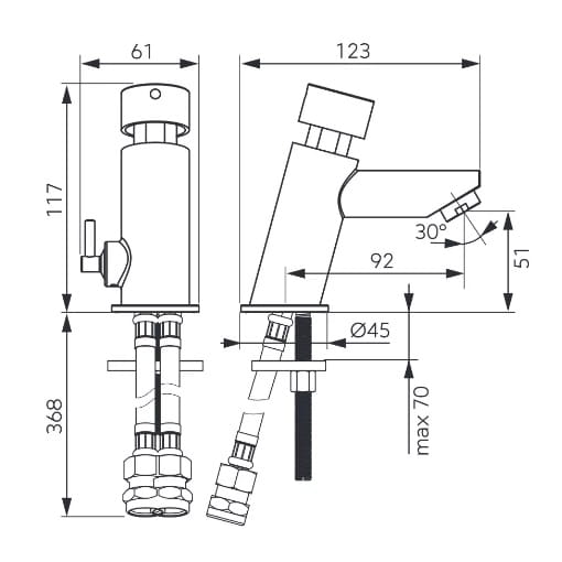 Dane techniczne: - fabrycznie ustawiony czas wypływu (dla ciśnienia dynamicznego 3 bar) [s]: 15 - zakres regulacji czasu wypływu (dla ciśnienia dynamicznego 3 bar) [s]: 10 - 20 - przepływ wody przy ciśnieniu dynamicznym 3 bar [l/min]: 9.8 - dopuszczalna temperatura wody: < 90 C - zalecany zakres ciśnienia [bar]: 1 - 5 - maksymalne ciśnienie statyczne [bar]: 10 - przyłącze elastyczne: 2 x G3/8 GW (przyłącza elastyczne)