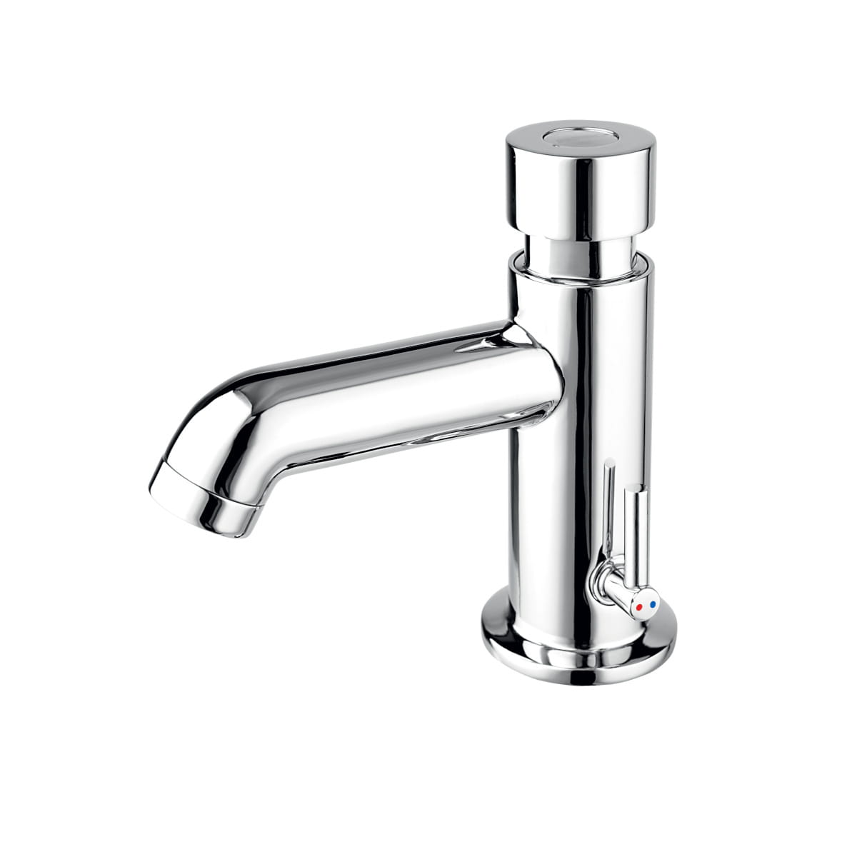 Główne cechy: - kolor: chrom - rodzaj: umywalkowa - typ: czasowa - montaż: stojąca - rodzaj wylewki: stała - z regulacją wypływu i z wbudowanym mieszaczem