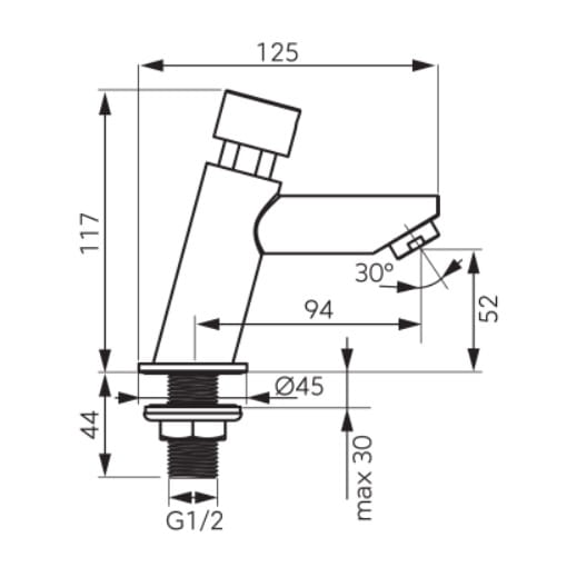 Dane techniczne: - fabrycznie ustawiony czas wypływu: 15 sek. (dla ciśnienia dynamicznego 3 bar) - regulowany czas wypływu w zakresie: 10 – 20 sek. (dla ciśnienia dynamicznego 3 bar) - przepływ wody przy ciśnieniu dynamicznym 0,3 MPa (3 bar): 11l/min - zalecany zakres ciśnienienia: 0,1 - 0,5 MPa (1 - 5 bar) - zalecana temperatura wody gorącej: < 65°C - przyłącze do instalacji wodnej: 1 x 1/2" GZ - zalecane mieszacze: -MM10 - mieszacz mechaniczny 3/8” -MT15B - mieszacz termostatyczny 1/2” - długość baterii: 125 mm - wysokość baterii: 117 mm