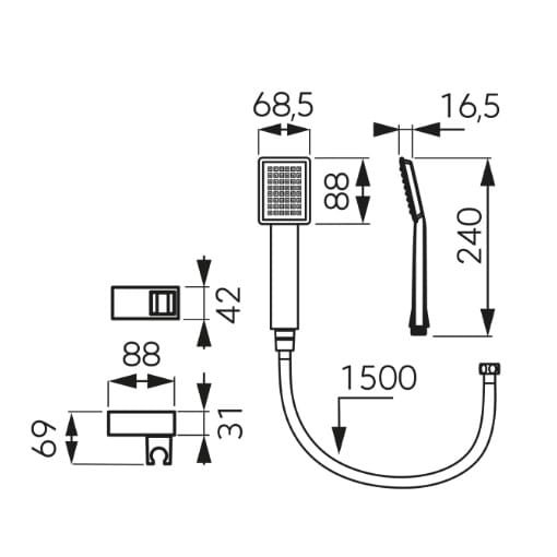 Dane techniczne: - wymiary tarczy rączki natryskowej: 68,5 x 88 mm - długość rączki natryskowej: 240 mm - długość węża natryskowego: 1500 mm
