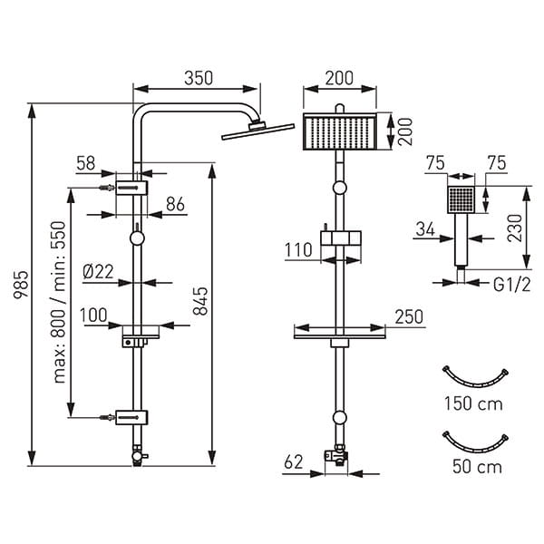 Dane techniczne: - wymiary deszczownicy: 200x200 mm - średnica przyłącza: 1/2" - długość drążka: 985 mm - długość węża natrysku: 1500 mm