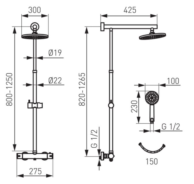 Dane techniczne: - drążek metalowy o regulowanej długości: 80 – 125 cm - głowica talerzowa stalowa SLIM o średnicy: 300 mm - przyłącze mimośrodowe G1/2 rozstaw 150 ± 20 mm - podłączenie deszczowni G3/4 wyjście górne - podłączenie natrysku G1/2 wyjście dolne - średnica rączki natrysku: 100 mm - wąż natryskowy 150 cm w oplocie metalowym