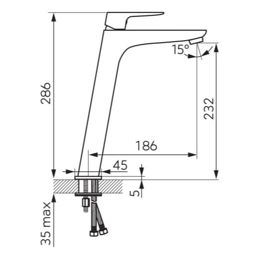 Dane techniczne: - wysokość baterii: 286 mm - zasięg wylewki: 186 mm - przyłącza elastyczne 3/8"