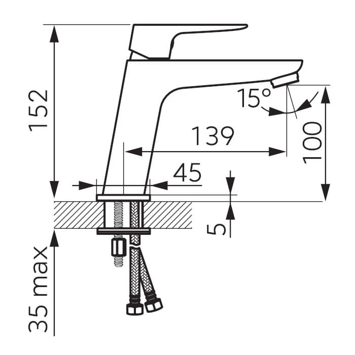 Dane techniczne: - wysokość baterii: 152 mm - zasięg wylewki: 139 mm - przyłącza elastyczne: 3/8" - M10x1