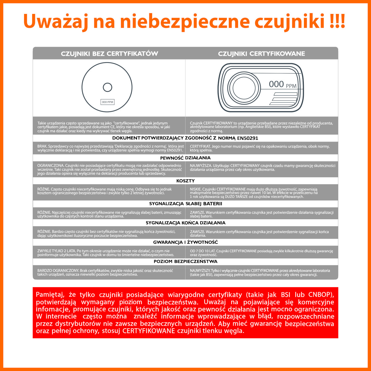 Główne cechy: - typ czujnika: czujnik tlenu węgla - typ baterii: wbudowana bateria litowa - zaawansowany sensor elektrochemiczny - inteligentny algorytm wykrywania - zwiększa szybkość reakcji po wykryciu niskiego poziomu CO - wielofunkcyjny wyświetlacz LCD, zmieniający kolor w zależności od rodzaju zagrożenia - funkcja pamięci - sygnalizacja wcześniejszej aktywacji alarmu - monitorowanie temperatury i wilgotności – dodatkowa sygnalizacja w przypadku zagrożenia - nowoczesny układ autokontroli z możliwością odczytu danych - łatwy montaż i obsługa - zasilany poprzez wbudowaną baterię litową, której nie trzeba wymieniać ani ładować przez cały okres użytkowania - certyfikowany czujnik tlenku węgla