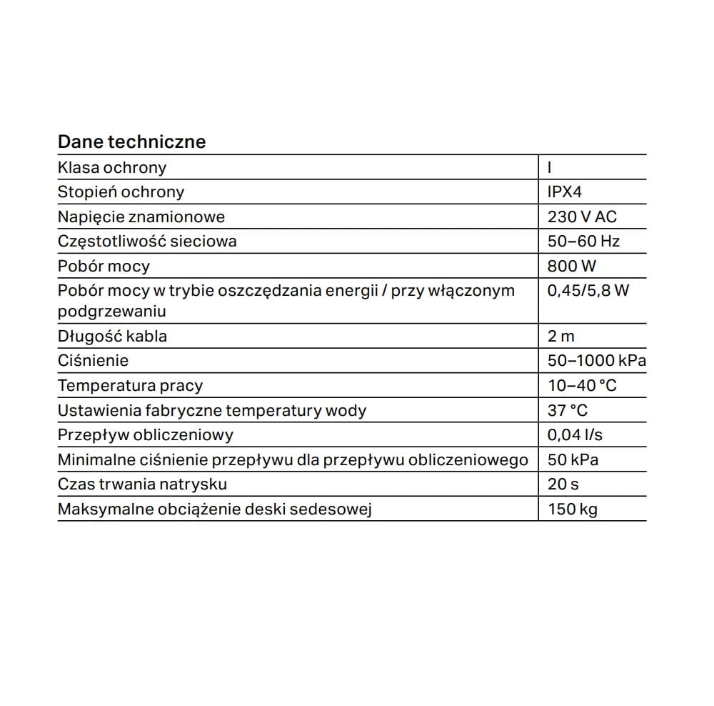 Zakres dostawy: - zestaw przyłączeniowy do przyłącza z boku z lewej strony - osłona zabezpieczająca - podkładki wyrównujące do deski sedesowej / miski ustępowej - elementy mocujące
