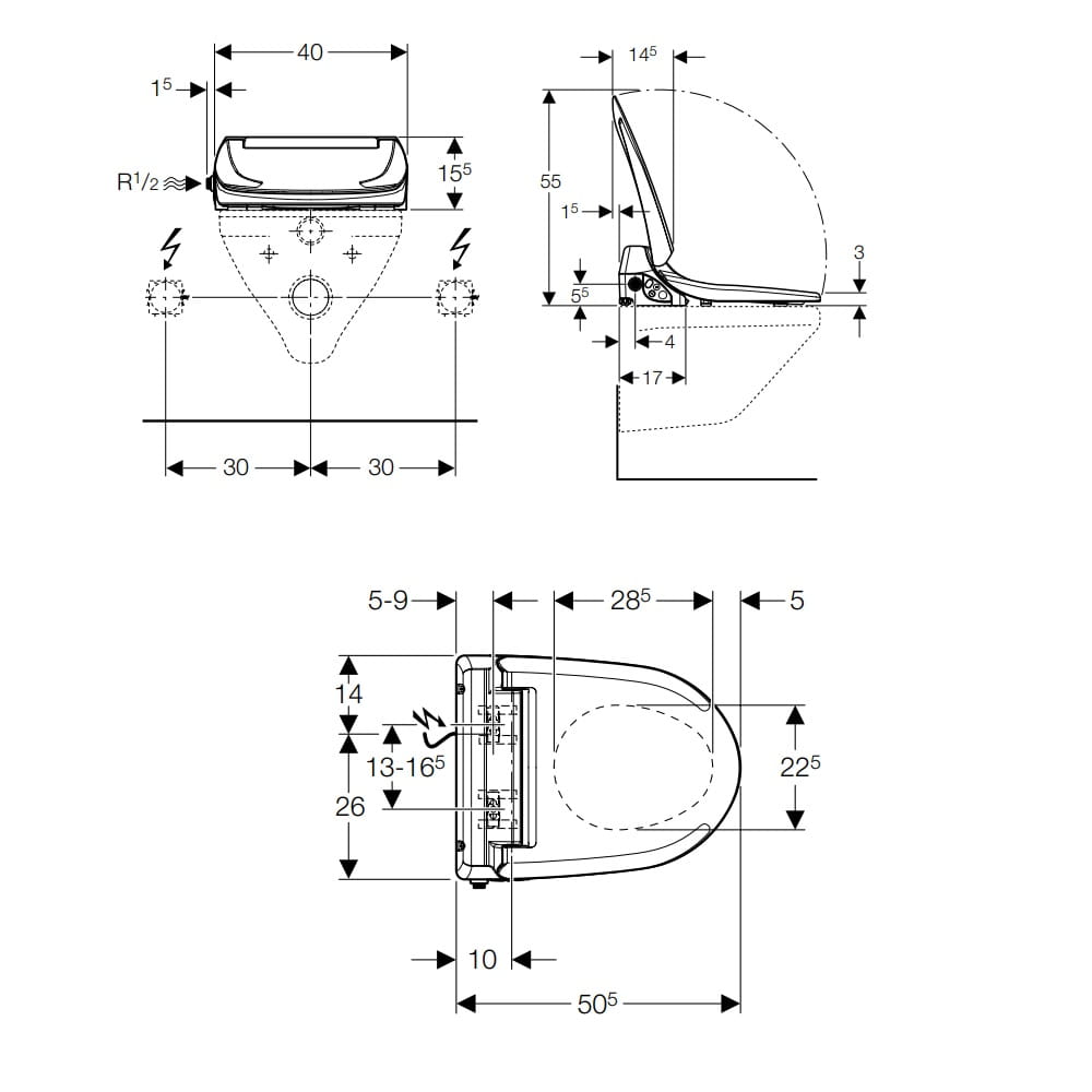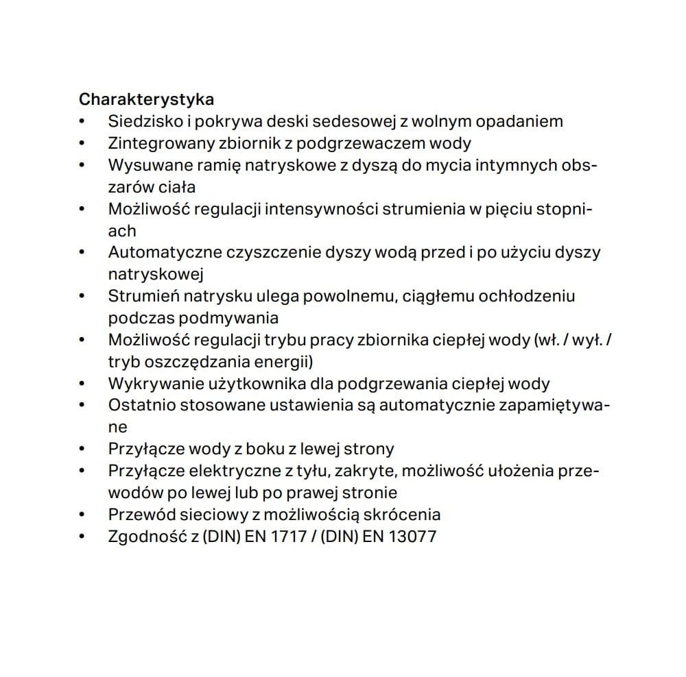 Główne cechy: - pięć ustawień poziomu ciśnienia - możliwość regulacji temperatury wody natrysku - funkcja wolnego opadania - funkcja QuickRelease ułatwiająca zdjęcie pokrywy deski sedesowej - wykrywanie użytkownika - tryb oszczedzania energii - możliwość łączenia z płyta ozdobną - mozliwość łączenia z modułem Geberit Monolith