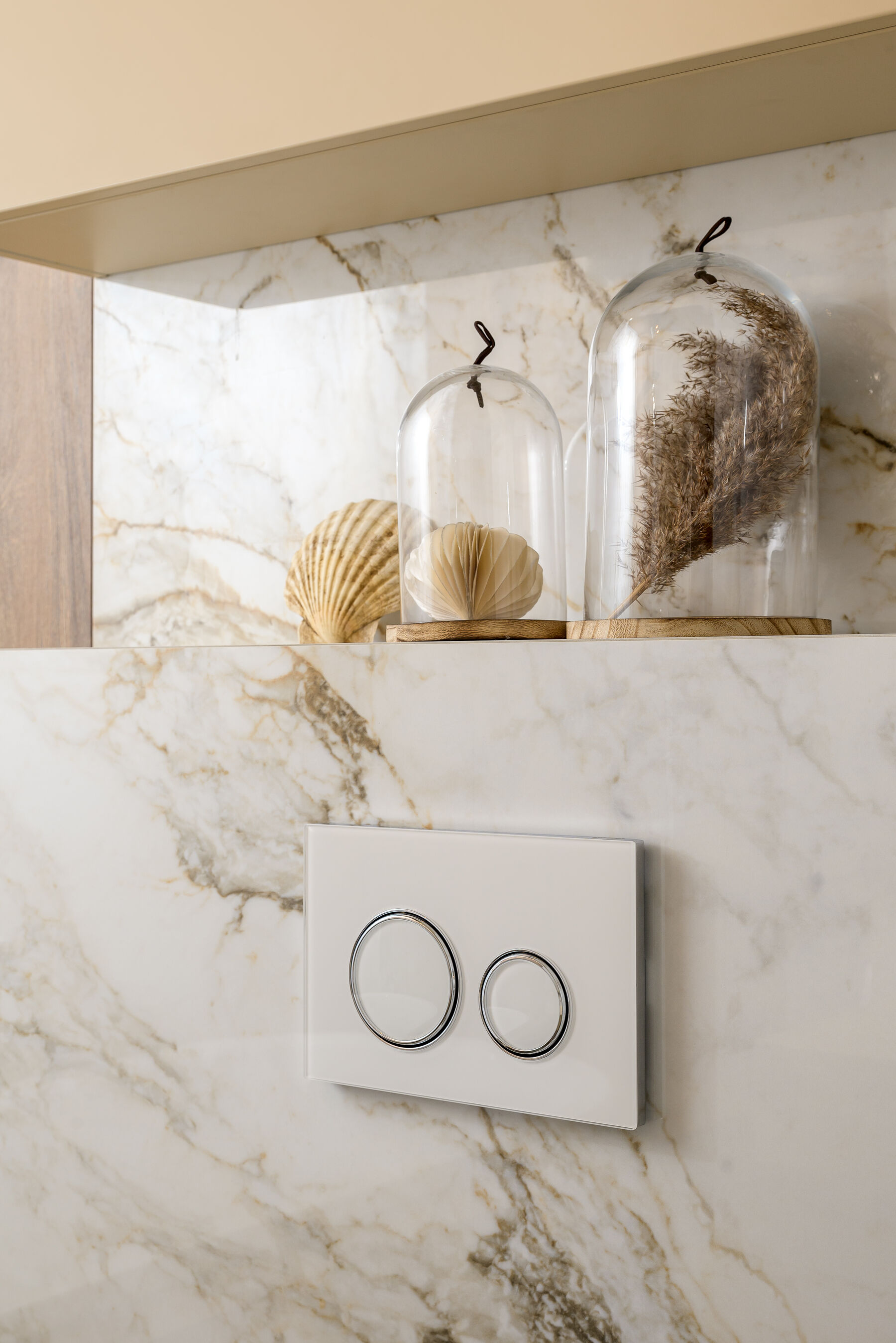 Geberit Sigma50 to elegancki przycisk spłukujący z szklaną powierzchnią w satynowym odcieniu, który wnosi do łazienki nutę nowoczesnej wyrafinowanej estetyki. Gładkie szkło nie tylko świetnie wygląda, ale też jest łatwe do utrzymania w czystości – wystarczy jedno przetarcie, by znów lśniło. Smukła forma i subtelnie oddzielone przyciski sprawiają, że obsługa jest intuicyjna i wygodna. Dwa przyciski pozwalają na wybór spłukiwania, co pomaga oszczędzać wodę na co dzień. Delikatny, płynny ruch i cicha praca mechanizmu podkreślają jakość wykonania. Sigma50 to doskonały wybór dla osób, które szukają nie tylko funkcjonalności, ale i prawdziwego stylu w strefie WC.