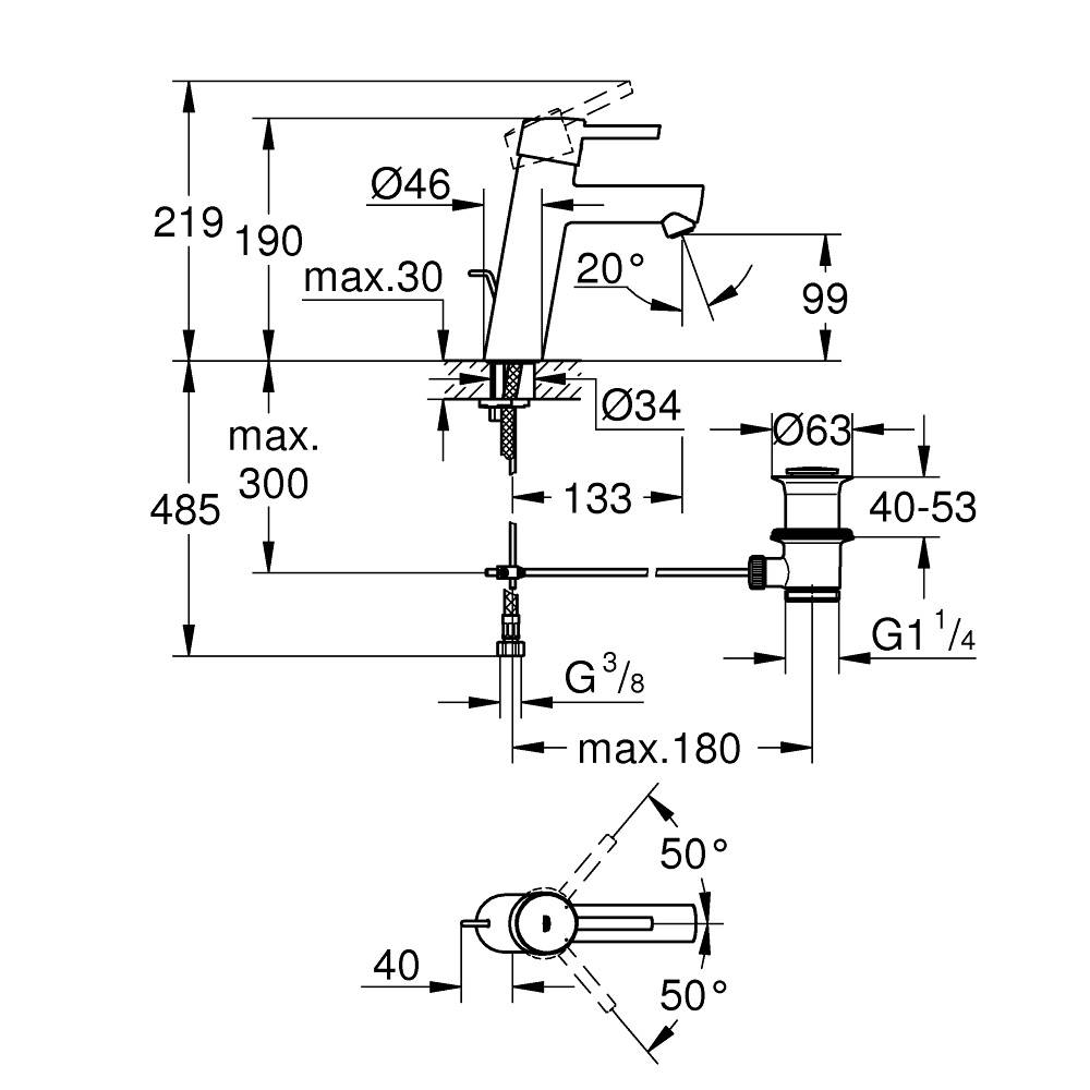 - zasięg wylewki: 133 mm