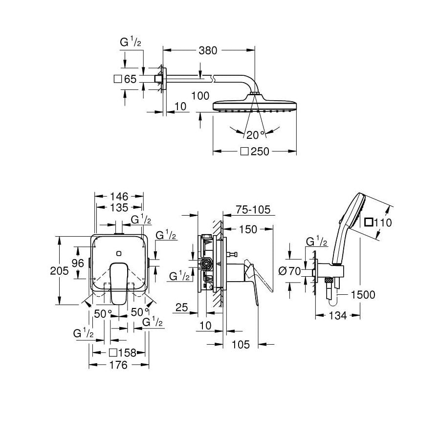 - Tempesta 250 Cube deszczownica z ogranicznikiem przepływu 9.5 l/min z ramieniem prysznicowym 380 mm
