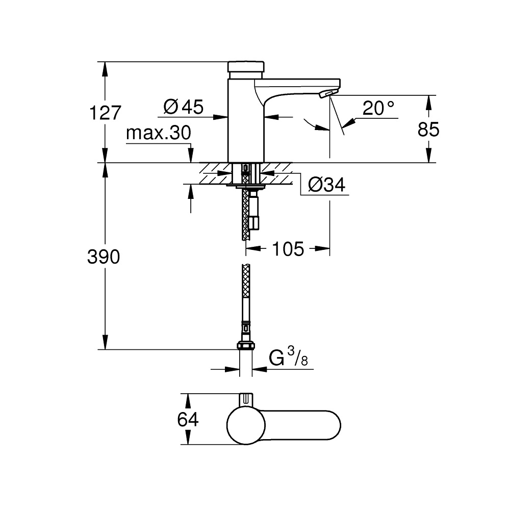 Dane techniczne: - maksymalne natężenie przepływu (przy 3 barach): 5 l/min - wysokość baterii: 127 mm - zasięg wylewki: 105 mm - przyłącze: G 3/8