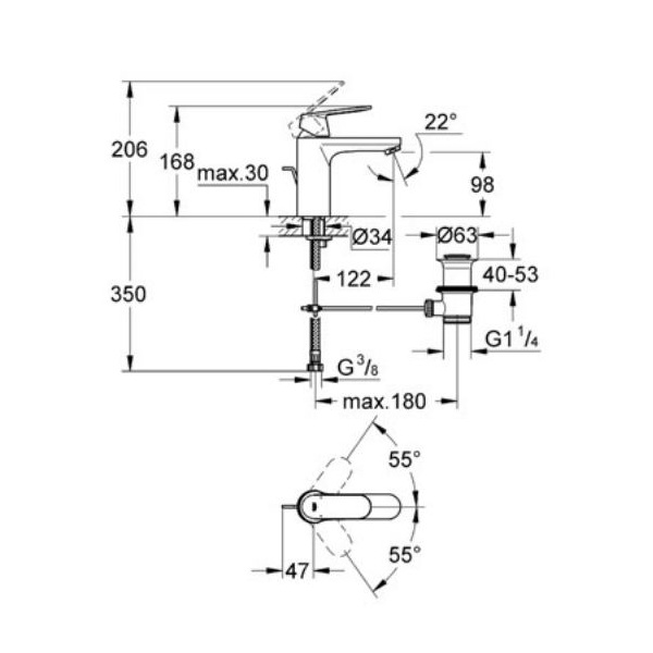 - zasięg wylewki: 123 mm