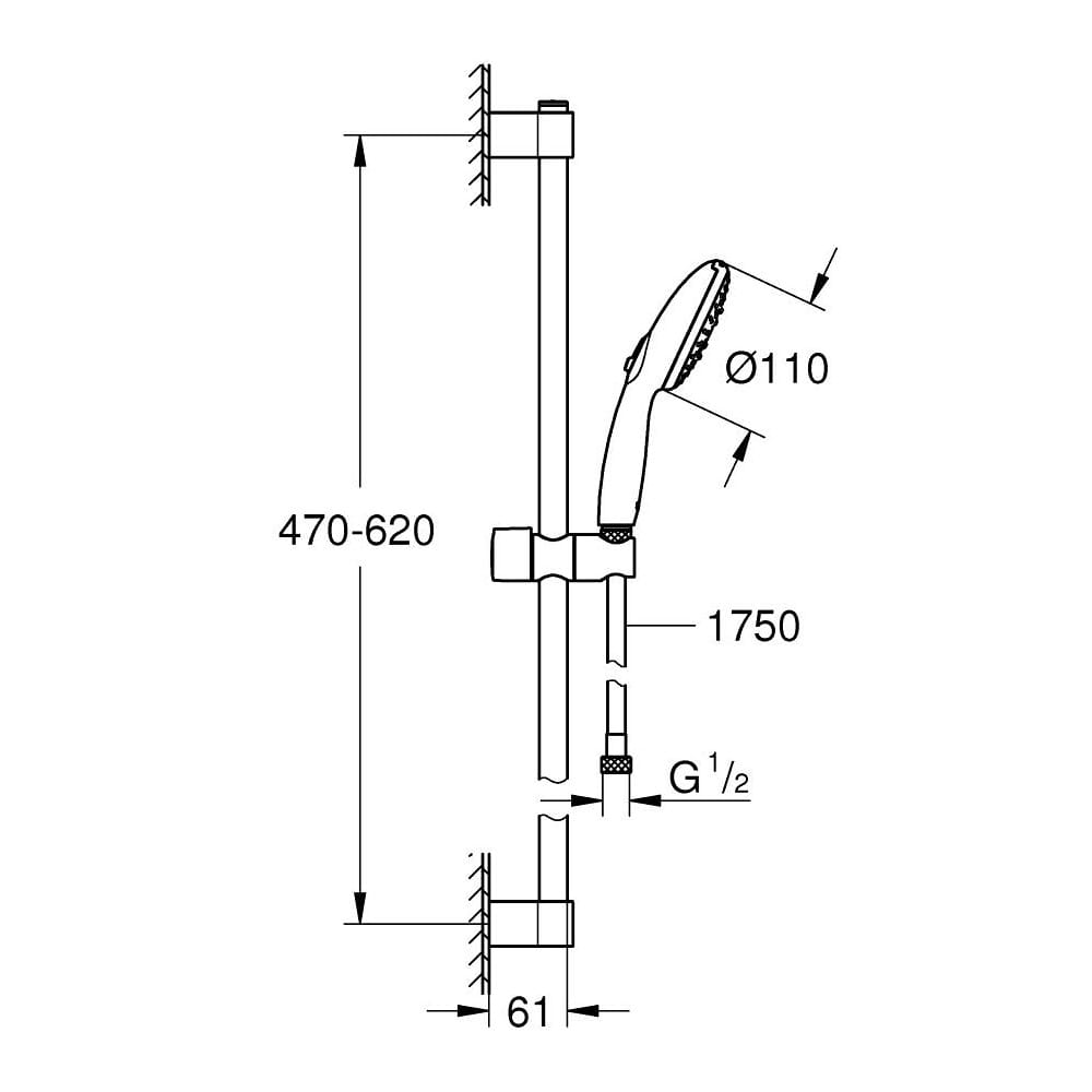 Dane techniczne: - rozstaw mocowań drążka: 470-620 mm - długość węża: 1750 mm - maksymalne natężenie przepływu (przy 3 barach): 13,5 l/min