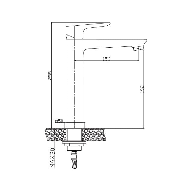 Dane techniczne: - mieszacz ceramiczny 35 mm - zasięg wylewki: 156 mm - wysokość baterii: 258 mm - wysokość baterii do perlatora: 192 mm - wężyki przyłączeniowe: 3/8', 40 cm (2 szt.)
