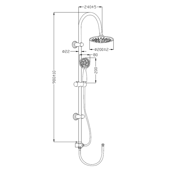 Dane techniczne: - długość drążka: 980+/- 10 - średnica głowicy talerzowej: 200 mm - długość węża natryskowego: 1500 mm - długość słuchawki: 200 mm - szerokość słuchawki: 80 mm