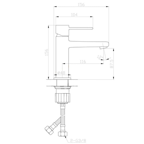 Dane techniczne: - wysokość korpusu: 156 mm - zasięg wylewki: 116 mm - wężyki przyłączeniowe 3/8", 40 cm x 2 szt.
