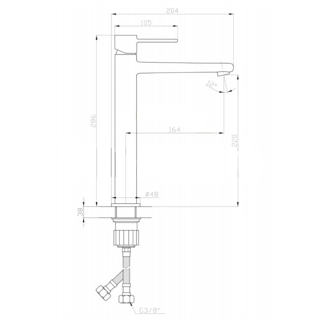 Dane techniczne: - wysokość korpusu: 286 mm - zasięg wylewki: 164 mm - wężyki przyłączeniowe 3/8", 40 cm x 2 szt