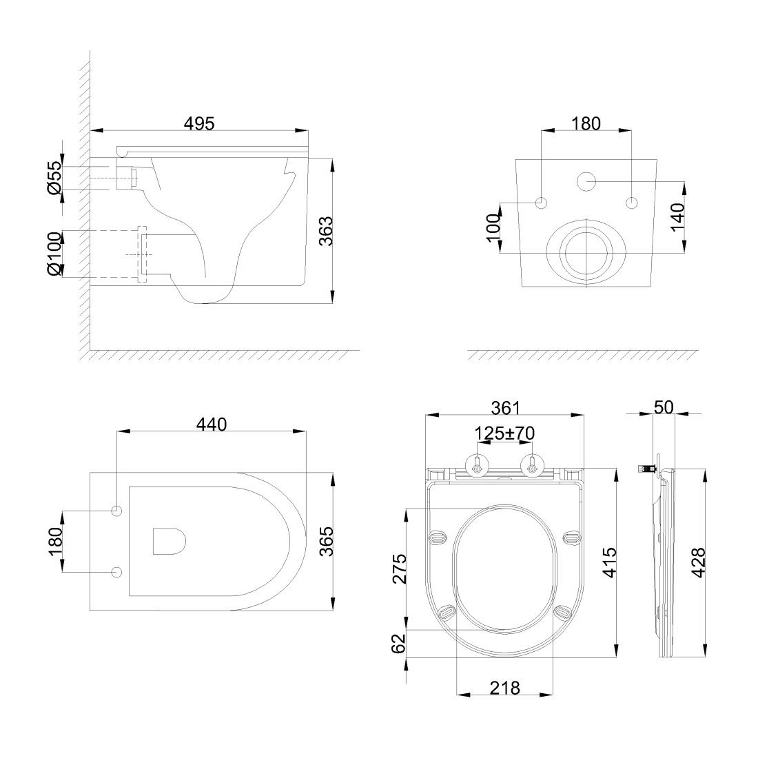 Dane techniczne: - długość: 495 mm - szerokość: 365 mm - wysokość: 363 mm - rozstaw mocowań deski: 180 mm - długość deski: 428 mm - szerokość deski: 365 mm